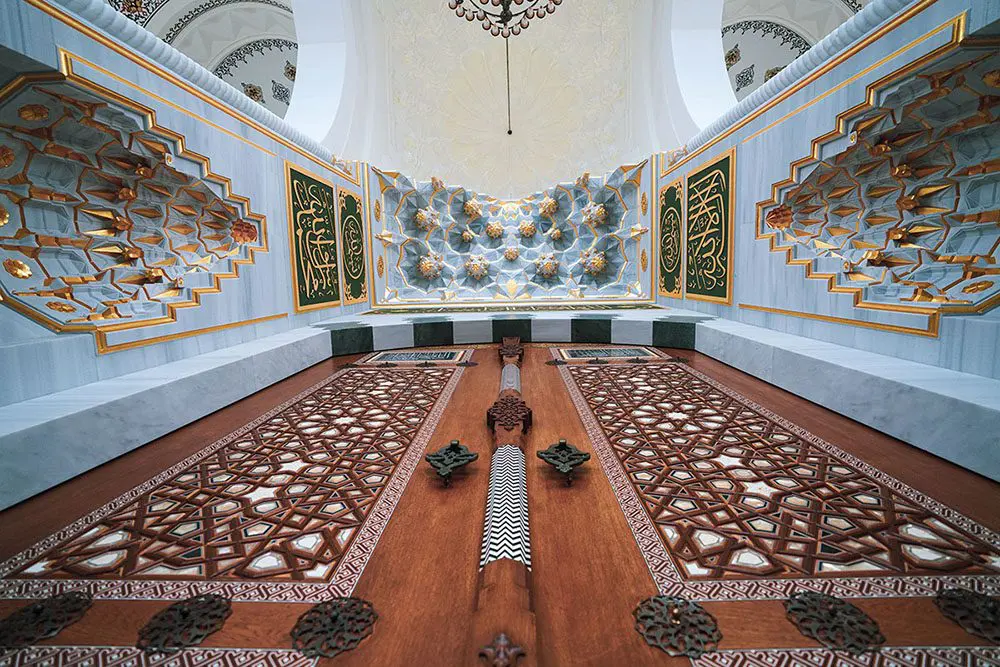 Inlaid with mother-of-pearl, the impressive wooden doors at the main entrance were made using kündekari, a decorative form of joinery favoured by the Ottomans that involves interlocking wooden pieces cut in geometric shapes. With no glue or nails used, the wood is better able to withstand heat and moisture and will remain in good condition for centuries.