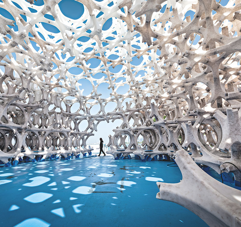 Wael Al Awar Alternative concrete is also a focus for Al Awar who is working with waste brine from the desalination process. His second prototype, Barzakh (top), was showcased at the 2024 Public Art Abu Dhabi Biennial. Barzakh photo: @ralphemerson_deperalta