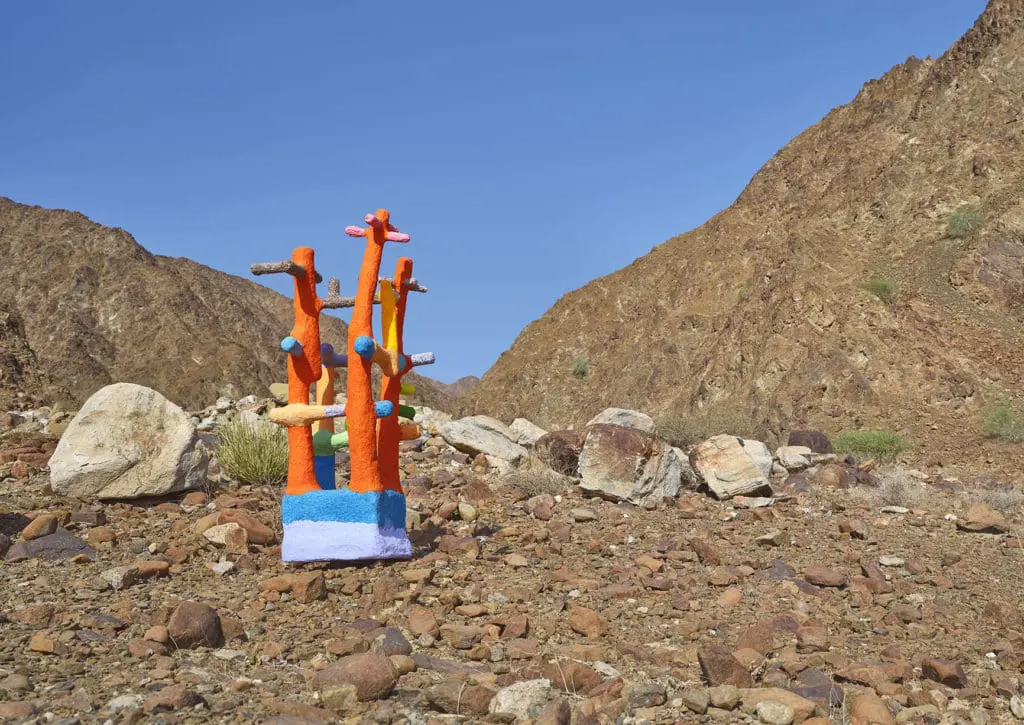 The title of the exhibition refers to the artist’s experience of light in Khorfakkan, where mountains cast the town in afternoon shade. The sculpture shifts from bright playful colours and forms to subdued black and white elements.