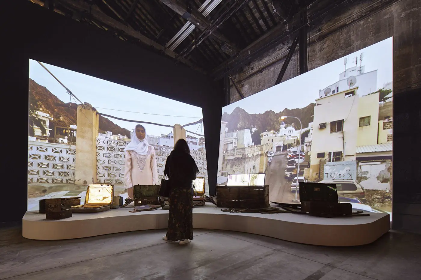 From top: the sultanate of oman pavilion; Samuele Cherubini, Courtesy of The Artist and The Visual Arts Commission, Saudi Arabia; Thierry Bal and Zineb Sedira; Federico Vespignani / LVAA