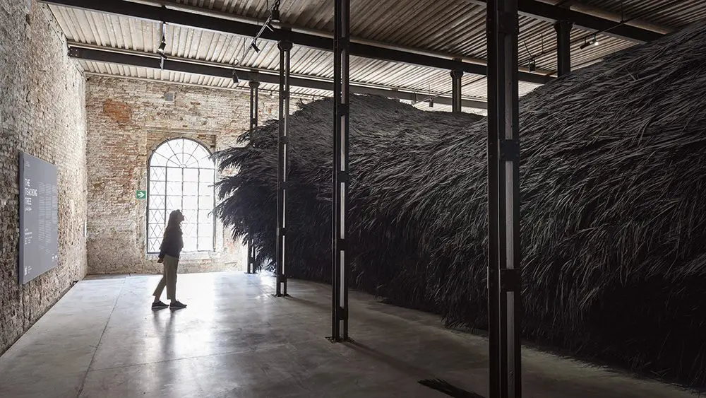 Riyadh-based Muhannad Shono, the sole artist at the Saudi Arabia pavilion, pushes further into abstraction with his monumental Teaching Tree. The 40-metre-long work continues his long-term exploration of the line as the fundamental facet of aesthetic creation. Made of palm fronds dyed jet-black and assembled by hand in the kingdom, the fluid, almost tentacular sculpture appears to snake through the room. Resembling as much a mark of Arabic calligraphy as a bird’s wing or the tail of a mythical beast, it also subtly moves, through the use of concealed pneumatics. It pushes against the confines of the room and even wraps itself around the metal pillars supporting the ceiling. At once natural and artificial, knowable yet fantastical, this strange object appears both welcoming and terrifying, as its sharply pointed “tail” seems poised to strike. While consciously emblematic of the rebirth of Saudi Arabia’s cultural sector, it also evokes enigmatic and primitive aspects of human consciousness and the natural world.
