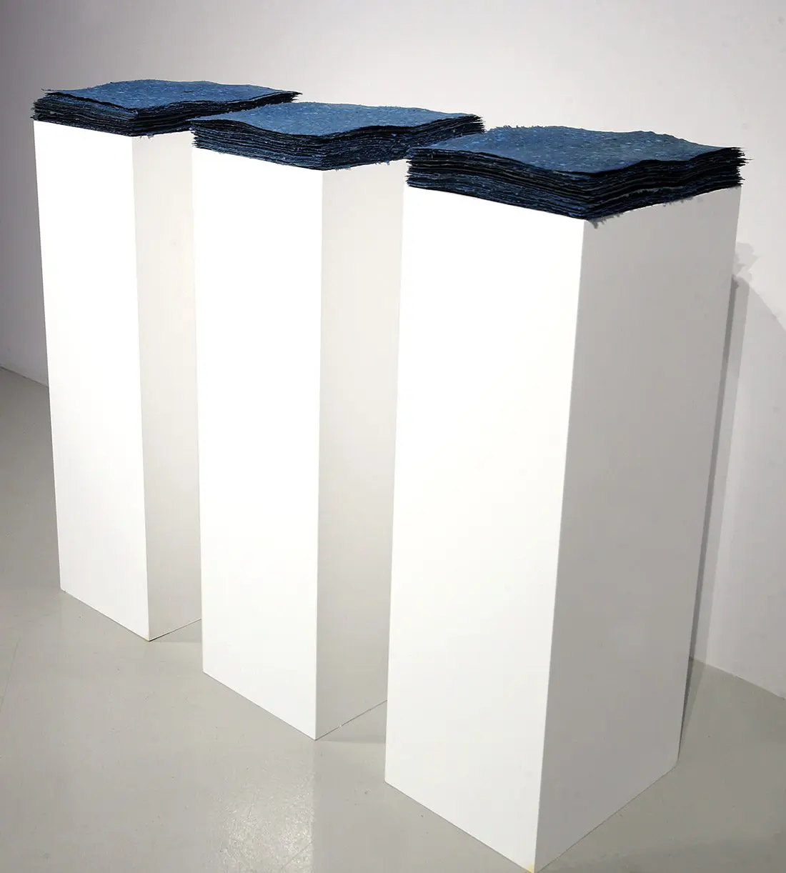 BLUE PRINT, part of a series of brick-shaped blocks from AN AUTOBIOGRAPHY OF COLOUR (2020). FOR THE THINGS THAT WILL REMAIN UNSAID (2020) contains 200 pieces of hand-made paper, each unique, (below).