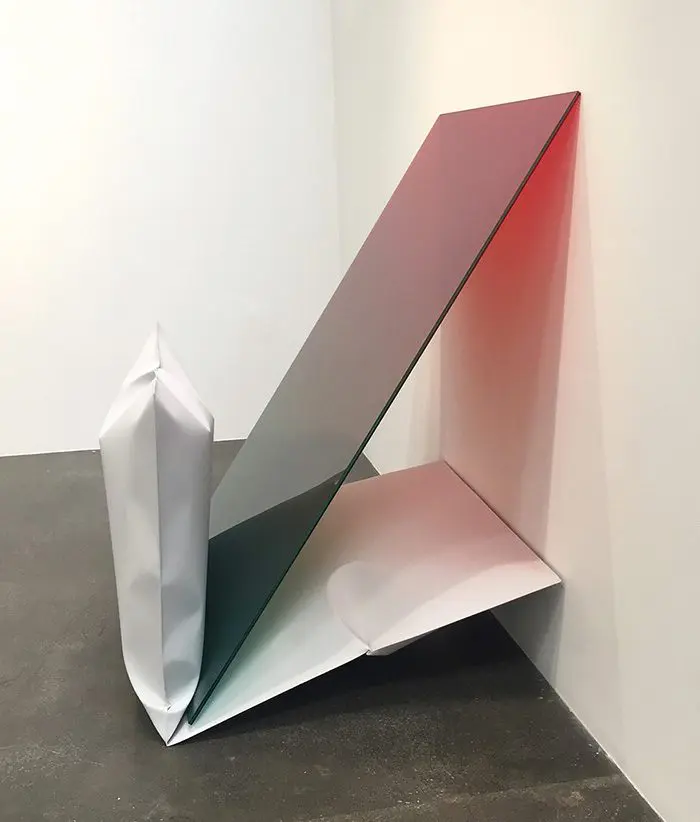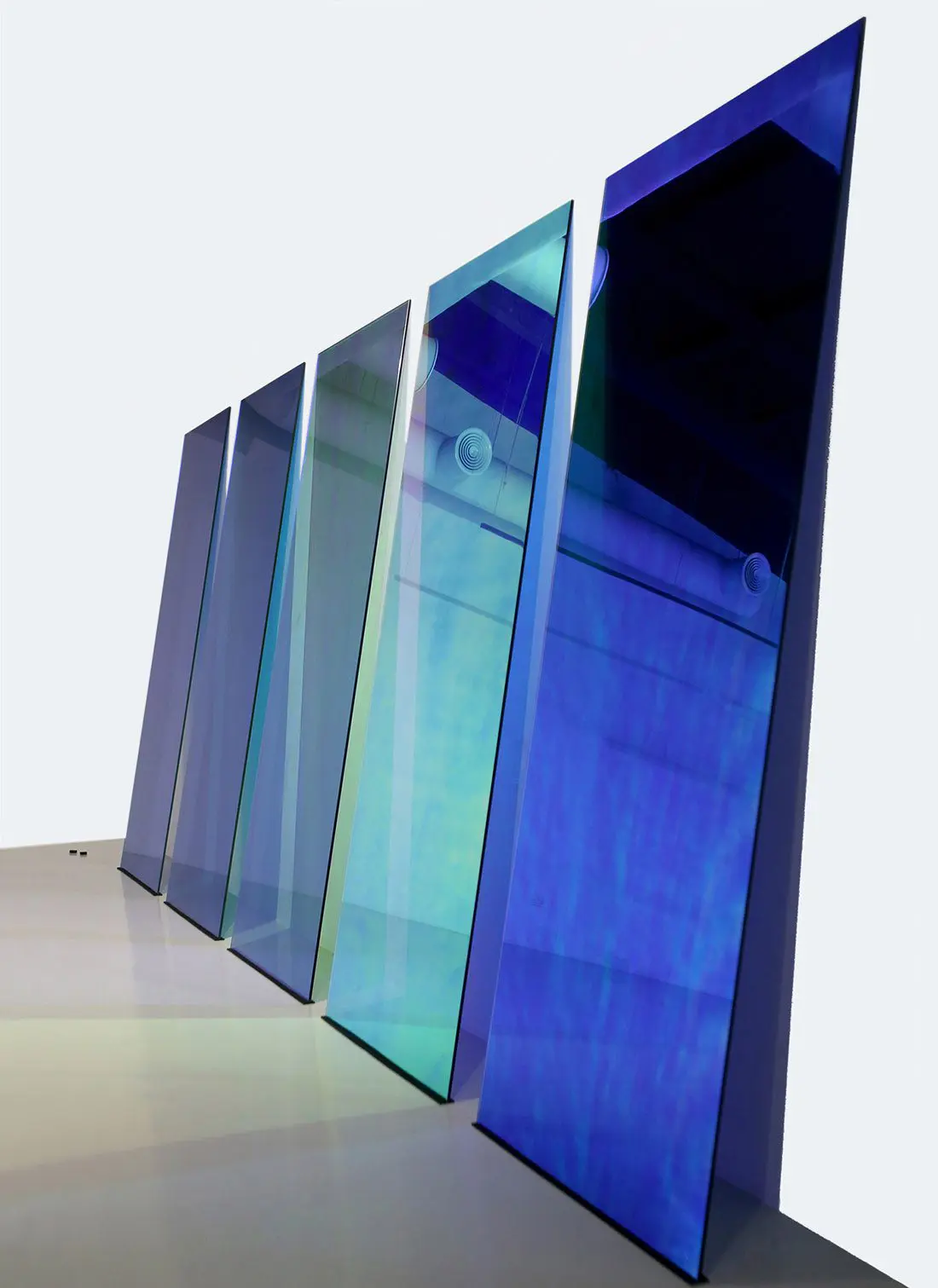 Self-reflection is probably best exhibited in the use of glass, to which Al Mazrou is no stranger. In Rearranging the Riddle, she introduced To Create Meaning in Perception (2020)—five large panels of glass, all in varying shades of blue, whose colour changes depending on the viewer’s position. Their imposing presence, which is simultaneously strong and fragile, can also be identified in previous exhibitions. Exhale (2018) from her last solo show at her representative gallery, Lawrie Shabibi in Alserkal Avenue, Dubai, used a pane of filmic glass to dissect a pillow-like sculpture and Al Mazrou’s Artist’s Garden commission for the Jameel Arts Centre—Green House: Interior yet Exterior, Manmade yet Natural (2018)—was also made of massive sheets of gradient-toned glass, this time in green.