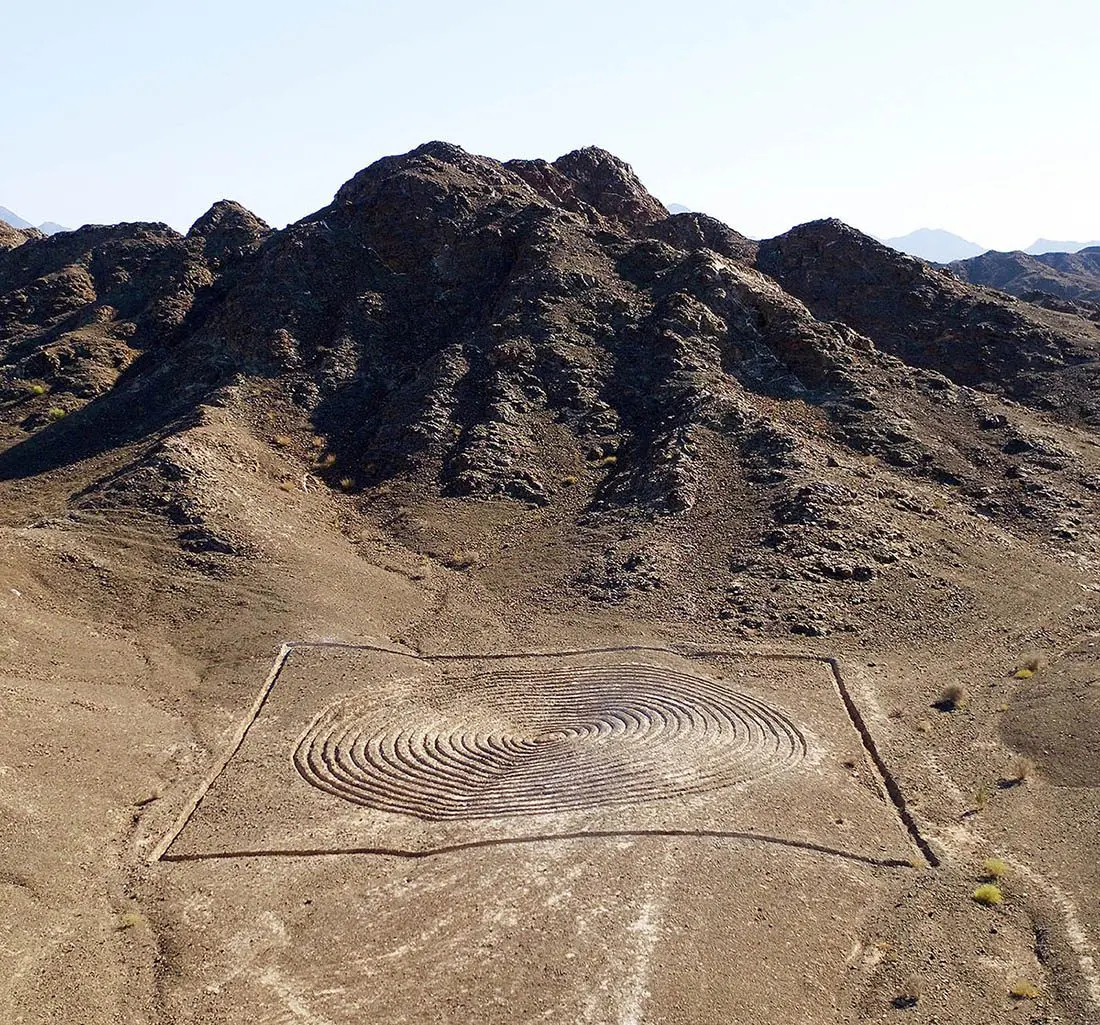 SAND-LAND (2017), a 225-square-metre land project in the Ras Al Khaimah mountains, a series of perfectly executed concentric circles. Courtesy of Lawrie Shabibi and the artist.