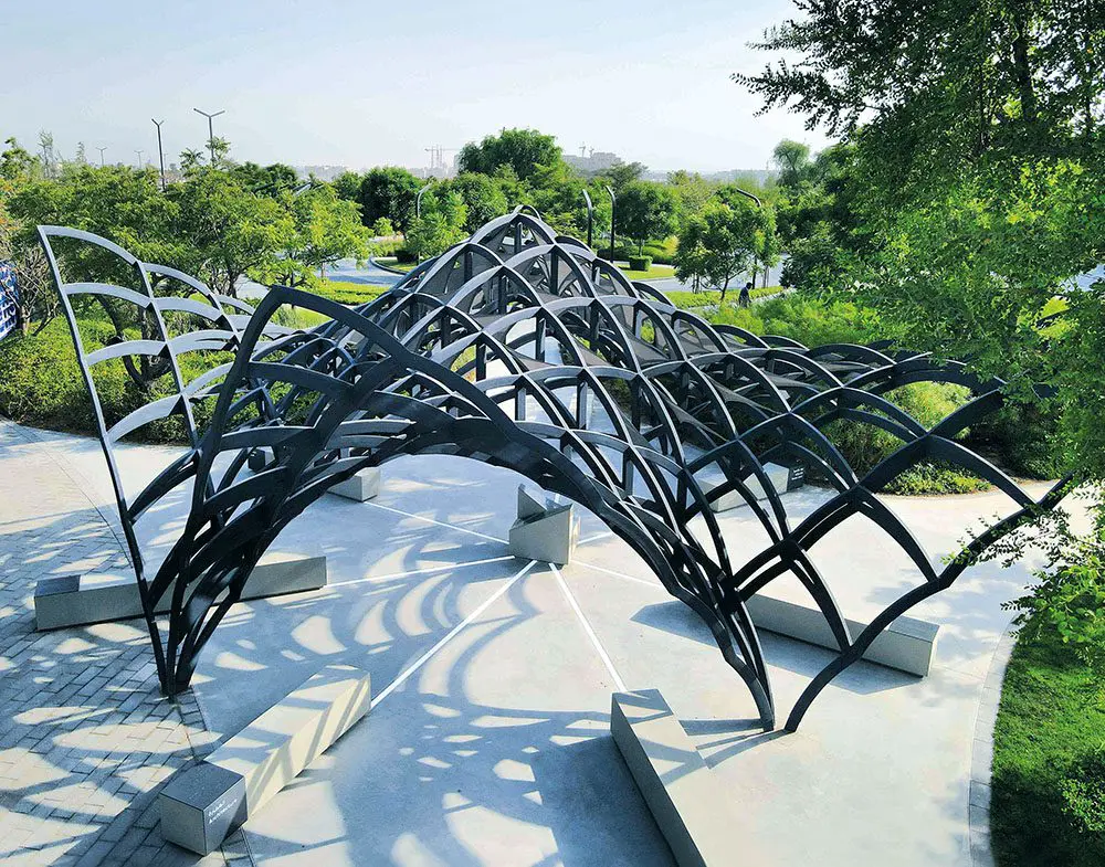 Al Janah, meaning “wing” in Arabic, is designed to offer a space for reflection, contemplation and inspiration at the heart of the Madar district. The design was inspired by muqarnas, a traditional and primary feature of Islamic architecture, a form of ornamental vaulting typically found on the underside of domes and characterised by fluidity and replication. In this contemporary interpretation, it is an intricate canopy that allows for playful shadows that change with the movement of the sun.