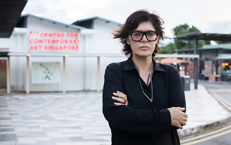 Top, the Biennale is staged in Diriyah’s JAX District. Above, artistic director Ute Meta Bauer. Top image courtesy of the Diriyah Biennale Foundation; Bauer photographed by Christine Fenzl.