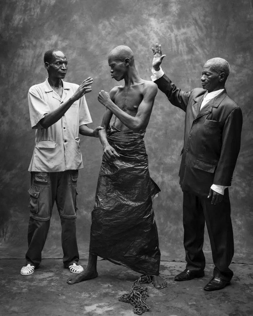 ROBIN HAMMOND Yendani Mathieu, centre, lives with a mental health condition. He is usually chained to a tree in the grounds of the Pentecostal Church of Bokiccenag, in northern Togo.