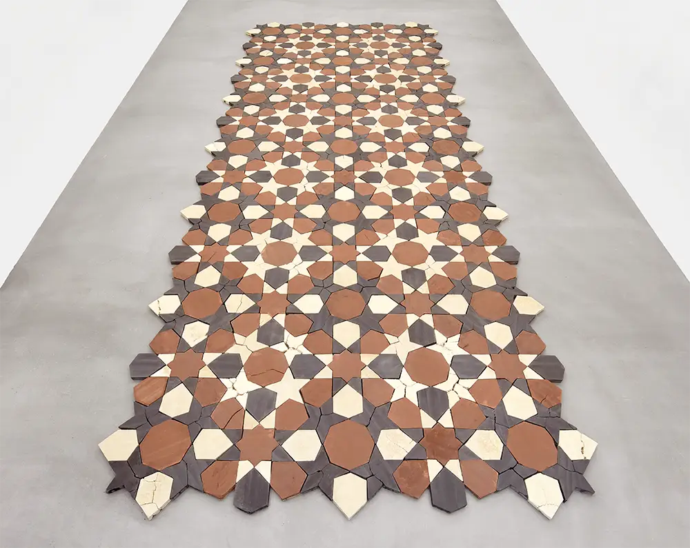 When Dana Awartani took her ruler and compass to recreate the geometric patterns that once adorned the walls of Qasr Al Basha, it was more than an artistic gesture. It was an act of healing, of remembrance, and “a melancholic visual requiem”. This poignancy translates into the physical and visual aspects of the work. Comprising a floor installation of 730 handmade clay bricks, made using ancient construction techniques in collaboration with artisans in Saudi Arabia, and a series of ink and gouache study drawings, Standing by the Ruins II is, as with so many of Awartani’s works, quiet and beautiful yet powerfully engaging. The bricks, rendered in three earthy tones, slot together in perfect harmony, yet are cracked and delicate due to the artist’s deliberate omission of a binding agent. Their dual strength and fragility reflect the vulnerability of the original structure, its architecture, and its history.