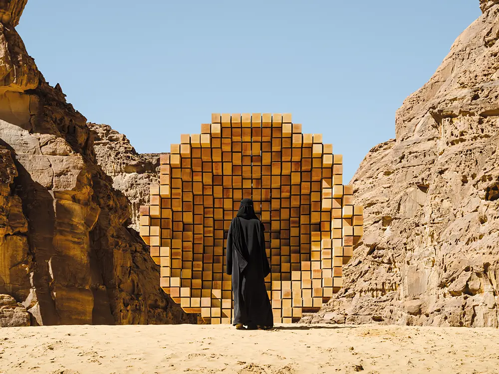 Top, Where the Dwellers Lay (2022). Shown at Desert X AlUla, a geometric sculpture references the Nabataean tombs at Hegra and their decorative facades. Above, When the Dust of Conflict Settles (2023) examines the repercussions of conflict on cultural heritage. Top, courtesy of the artist and Desert X AlUla; Above, courtesy of the artist.