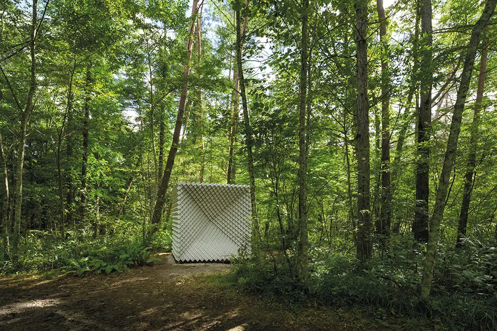 When Our Paths Collide (2024). This sculpture, in Omachi City, Japan, was inspired by the history of the salt trade. Salt was harvested from the shores of the Sea of Japan and transported inland. These routes were known as Salt Roads. Made from locally sourced materials, the cubic shape of the artwork echoes the geometry of salt crystals. Courtesy of the Artist and the Northern Alps Festival