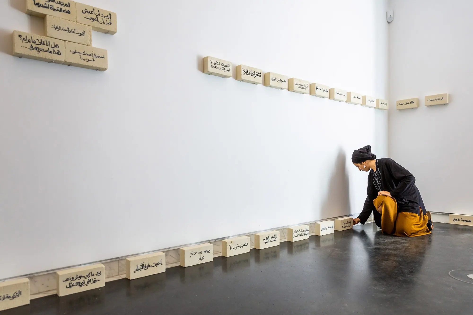 Take the installation Silent Protests by Tewa Barnosa, seen this summer in the Totalitarian Props exhibition at The Africa Centre in London, curated by Elageli and Barnosa. Past iterations of the work used calligraphy to write, on bricks, political and protest slogans originally seen on the walls of Tripoli as graffiti. The version on display in London referenced the chaos of property records in Libya, which makes it near impossible for Libyans to reclaim their house or land and be protected by law. The work echoed names written on houses around Tripoli by those trying to reclaim ownership: “It is about the written word, and how Libyans use walls to express their aspirations, delusions, and hopes,” Elageli says.