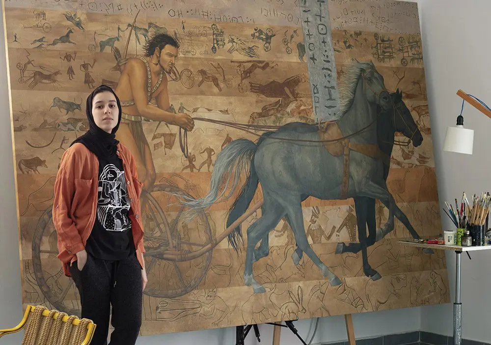 SAHARA CHARIOT–THE GARAMANTS (2020), above, by Shefa Salem, a visual artist born and raised in Benghazi. Part of the Identity Project, the painting explores the art of early inhabitants of Libya on cave walls, valleys and desert rocks. Photo courtesy of the artist.