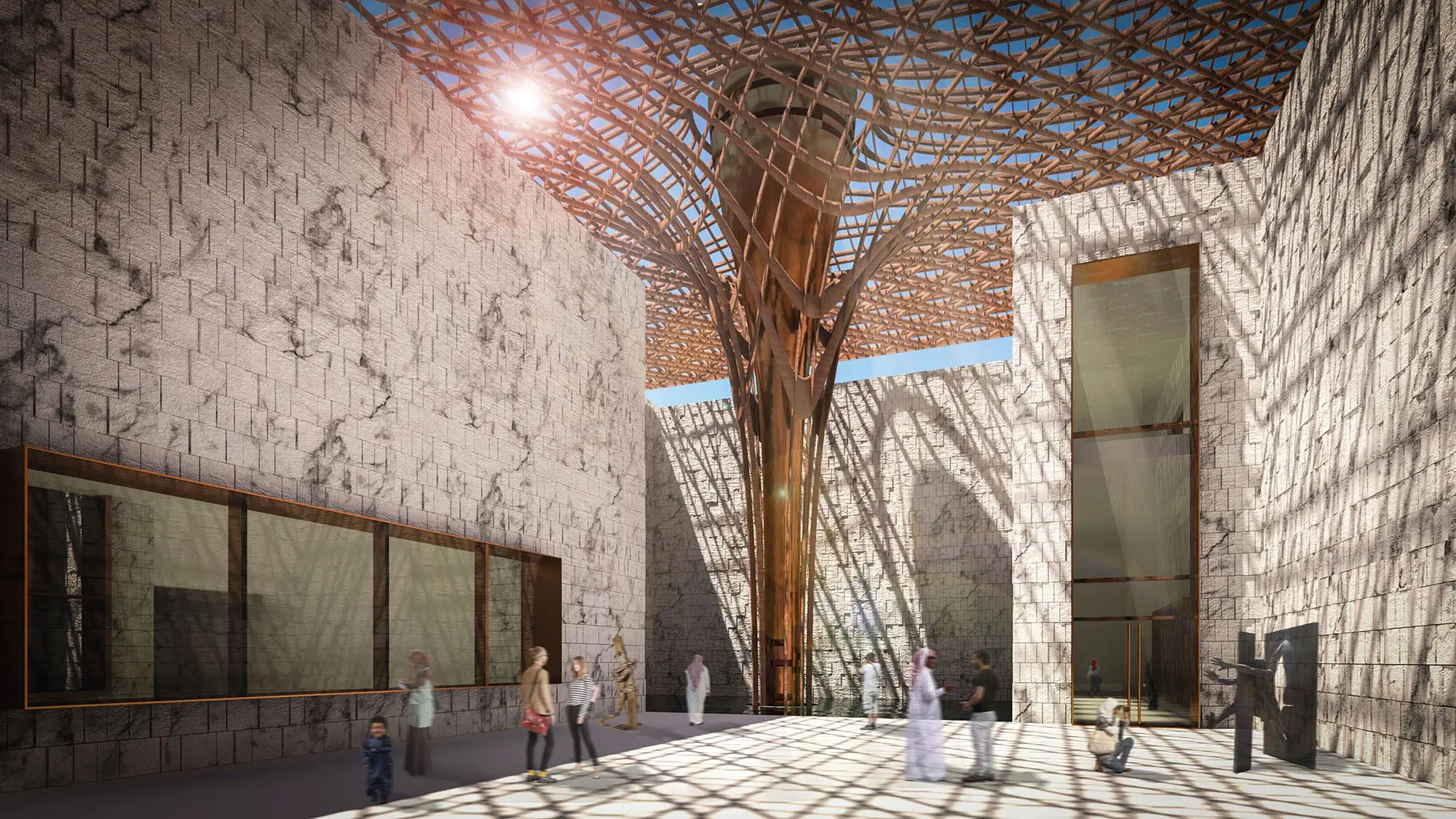 From the courtyard, the canopy contrasts with the museum’s simple forms for the effect of a mashrabiya, a traditional element of Middle Eastern architecture used as a window or spatial partition. Filtering the light that enters while still inviting a breeze, the canopy activates interior walls as the sun “dances across them throughout the day,” say the prize judges.