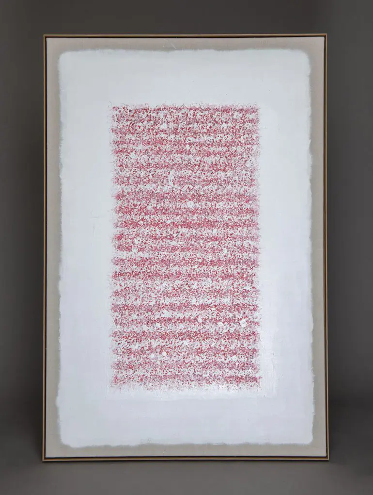 One such text inspired the work on view at Tashkeel’s Covid Conversations, which closed on Jan. 4. The group exhibition by UAE-based artists and designers showcased works that respond to their diverse experiences of the Covid-19 pandemic. Featuring spirals and scrolling motifs with a technique underpinned by the abstraction of calligraphic patterns, Al Haj’s Untitled (2020) is drawn from ancient Chinese lore which reads “An invisible red thread connects those who are destined to meet, regardless of time, place, and circumstance. The thread may stretch or tangle, but it will never break.” Hung solemnly like a prayer, red ink breaks up the stark whiteness of the canvas. Applied in careful meditation, the lines of abstracted Islamic lettering, while barely legible, are nonetheless formidable. Even though Al Haj laughingly proclaims that he’s “…really good at English cursive, but atrocious at Arabic handwriting,” this imperceptibility of text is no failure by the artist. Rather, it takes inspiration from a significant art movement that took place in the Arab world at the beginning of the 14th century, peaking again in the mid 20th century, called Hurufiya. Melding the traditional with the contemporary, the technique focuses less on readability and decryption, and more on deconstructing and foregrounding the formal elements of the Arabic letter.