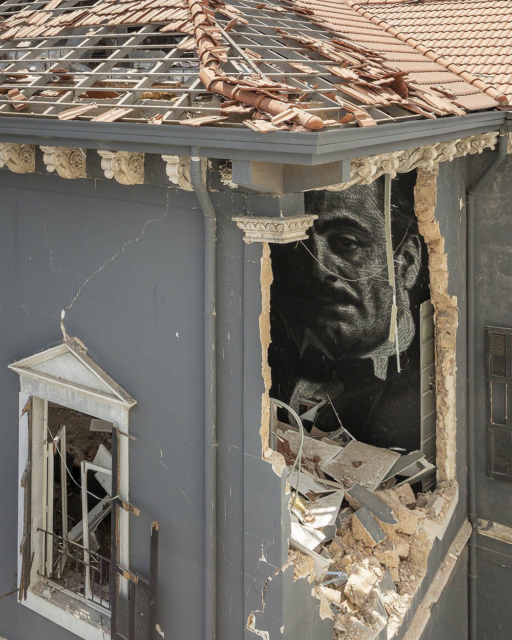 Through an enormous hole in the facade at nearby Villa Mokbel, he saw a black-and-white mural of the poet Khalil Gibran—an emblem of Lebanon’s artistic and intellectual history. He shot a now-iconic image of Gibran’s shadowed face, framed by collapsed masonry, and exposed rafters littered with smashed tiles. Half an hour later, the wall collapsed.