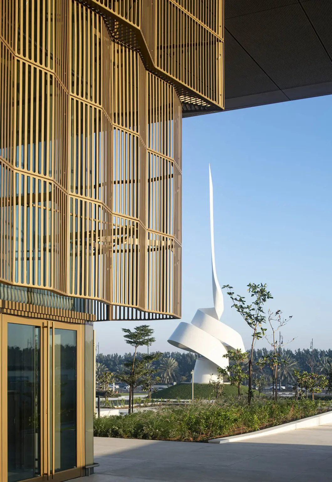 The central courtyard recalls traditional Islamic architecture. Open to the sky and filled with plants and water features, it provides a connection to nature and a place to relax.