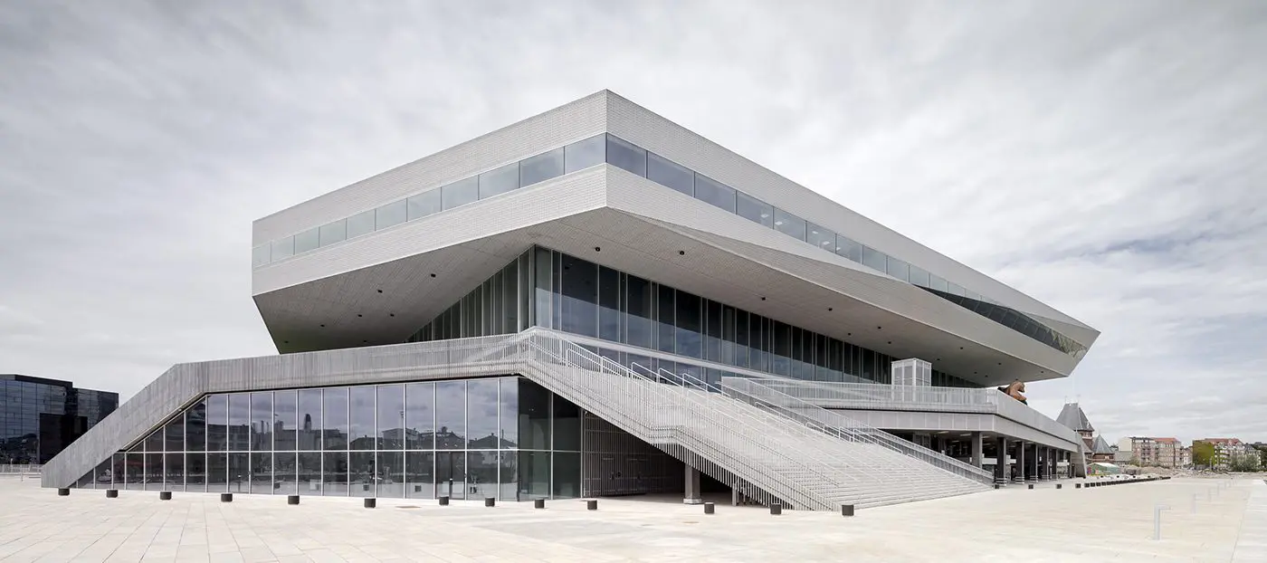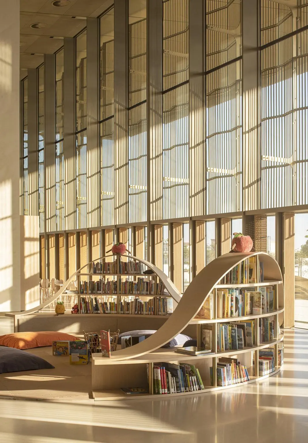 Dokk1, in Aarhus, Denmark, revives former dockyards on the city’s eponymous river. Schmidt Hammer Lassen designed the building as a “mediaspace,” and the library calls itself “the citizens’ house” where residents can access local government services. In addition to a café (now de rigueur in public libraries), it has play areas, a children’s theatre and multimedia, including games.