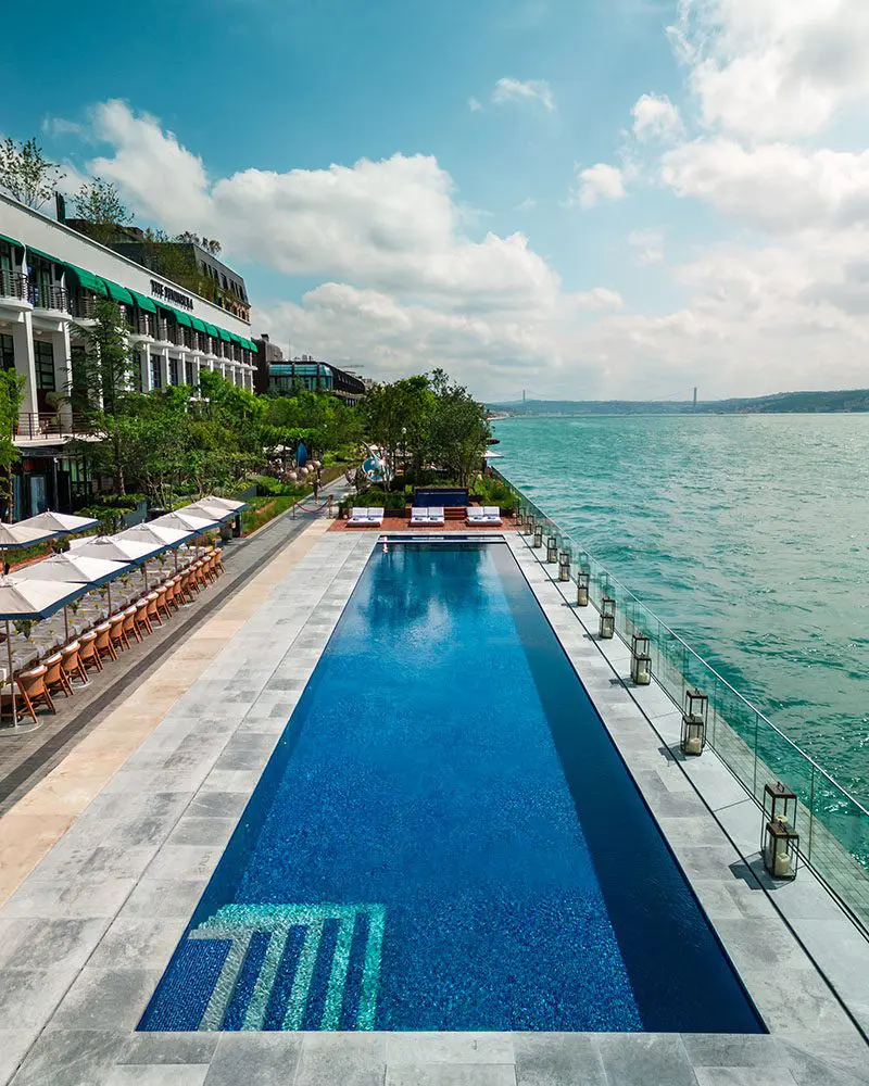 But on a sunny day in July, visitors hurry past these details to get out onto the terrace and soak up some of the most extraordinary views in the city. A five-piece band plays jazz beneath the concrete pergola, another original feature of the passenger terminal, as well-dressed guests sip tea on striped chairs reminiscent of a cruise liner. In the gardens, designed by Swiss landscape architect Enzo Enea, more than 250 mature trees have been planted, including pistachio, honey locust and plane trees, as well as fragrant herbs and flowers—thyme, rosemary, lavender. But the highlight of the hotel’s outdoor space is the infinity pool, so close to the Bosphorus that you see passengers on the ferries as they pass.