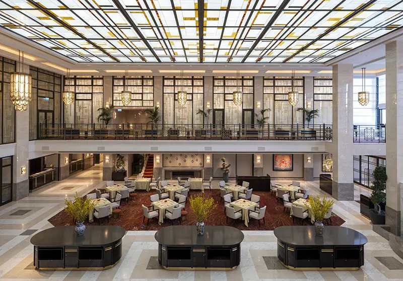 The lobby is a vast, light-filled space, stretching from the street entrance to the waterside terrace. As a passenger terminal, it would have been a dramatic starting point for a journey by sea, and it still retains a sense of romance. The eight-metre-high ceiling is made of glass tiles in shades of amber and white, “reminiscent of Bauhaus, with the spirit of Frank Lloyd Wright,” Erdemli says. Dramatic chandeliers echo Art Deco lanterns, a nod too to the Peninsula Hotels’ Hong Kong heritage—the hospitality group, Asia’s oldest, was founded there in 1866—and to the Silk Road that connected China and Turkey. Classic Ottoman designs like Iznik tiles and chintamani motifs are thought to have originated in China.