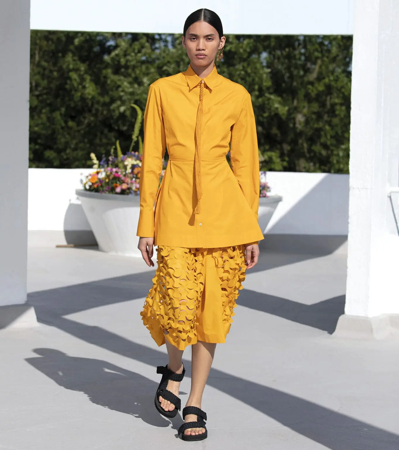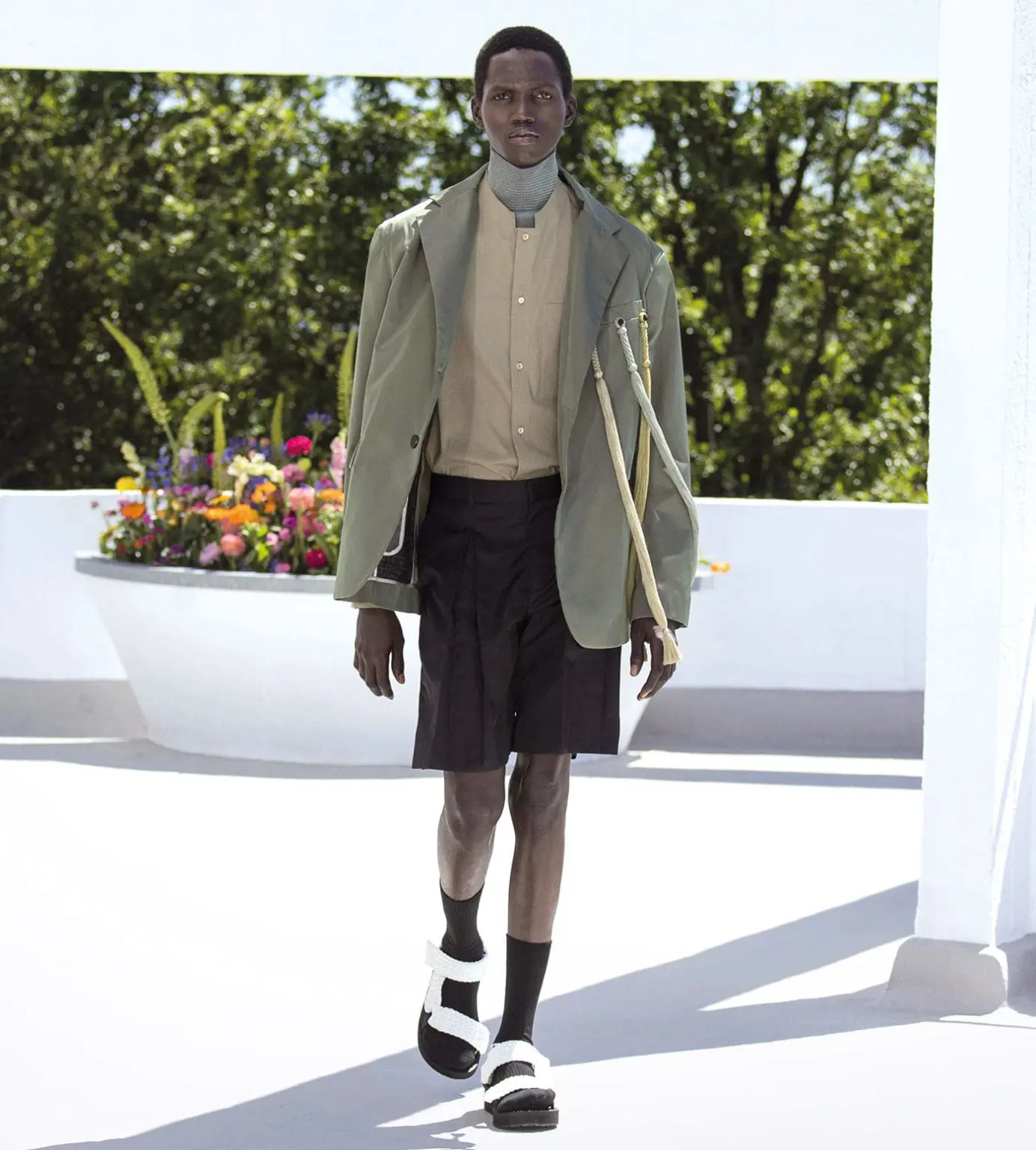 Qasimi staged a colourful show at St. Ann’s Court, a country estate in Surrey, near London. Bright bougainvillea pink, saffron yellow, and deep aubergine contrasted with the military sage green that Qasimi often uses. Skirt-trouser hybrids used technical fabrics and deconstructed tailoring. Matching capes had built-in bucket hats. Fluttery razor designs cleverly mimicked military canopies on boxy jackets and shirts.