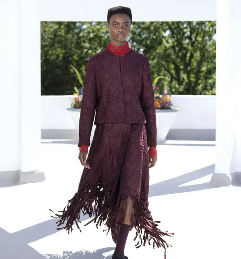 Sheikha Hoor Al Qasimi, creative director of the London fashion house, collaborated with Sharjah-based Irthi Contemporary Crafts Council, an affiliate of NAMA Women Advancement Establishment. The partnership follows on from last season, where Qasimi also used Irthi artisans to incorporate sadu, the geometric patterns traditionally handwoven by Bedouins, into its collection for Autumn/Winter 2021. For SS22, Sheikha Hoor wanted to celebrate the work of female artisans by looking to Irthi’s Bidwa Social Development Programme. The initiative aims to preserve traditional Emirati crafts while supporting the female artisans doing the work. “I think it’s important to respect the craft and how craftsmen and women spend their life trying to perfect something,” Sheikha Hoor says. “To acknowledge where the work is coming from, rather than trying to appropriate something, copy, or take credit, and going directly to the source, I think, is really important.”