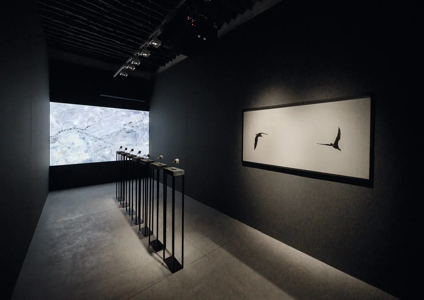 Perhaps one of the most rewarding elements of diving into Sarkissian’s practice is that peeling back the layers reveals more about the context. From the personal kernel of memory at the core, the work pans out through regional history to worldwide struggles. And, although much of his work focuses on human struggle, one series that was initially exhibited at Sharjah Biennial in 2019 tells the plight of the northern bald ibis. Having been declared extinct in the wild in 1989, in 2002 a surviving colony of seven birds was discovered in the Syrian desert near Palmyra. The colony was intensively studied and protected until the war in Syria broke out, and then disappeared again around the time Palmyra was destroyed in 2014. Final Flight (2018-2019) consists of seven resin casts of the northern bald ibis skull, an archival inkjet print of the last photograph taken over Palmyra of the birds, a hand-milled relief on aluminium of the birds’ migration route from Syria to Ethiopia, and a film capturing the route in bird’s-eye view.