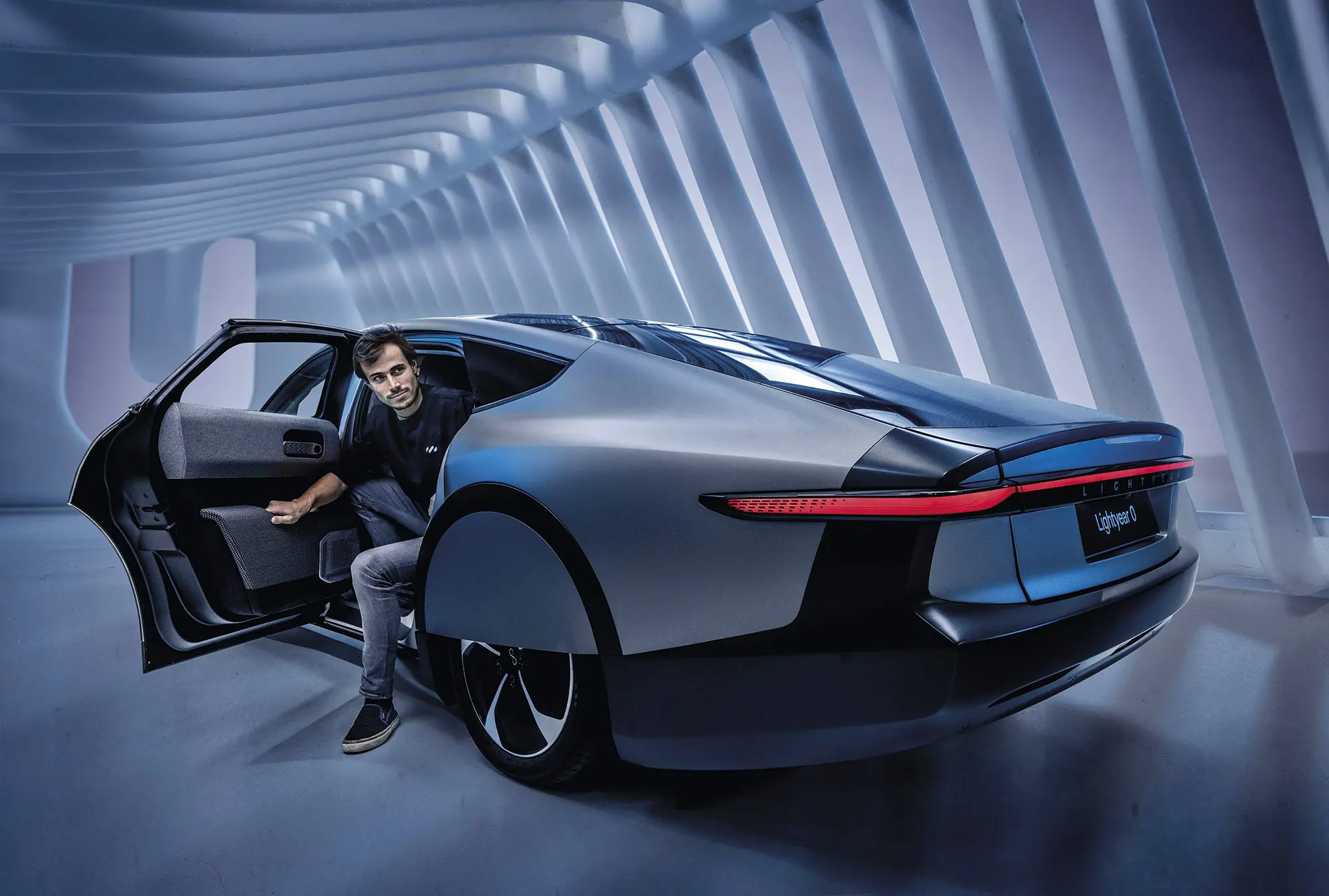 The prototype, Lightyear 0 is exceptionally aerodynamic; the low drag coefficient means less energy consumption and more range. Lex Hoefsloot, Lightyear’s chief executive, top image, has big ambitions for the technology. Top photo: Martin Dijkstra/Lumen Photo; Above: Lightyear.