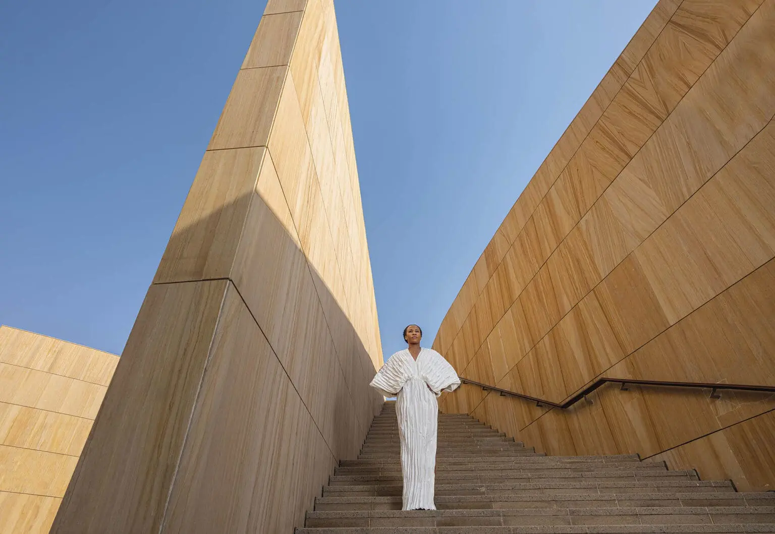 Tosin Oshinowo was shot at MLEIHA ARCHAEOLOGICAL CENTRE in the Sharjah desert. The complex offers insight into a unique archaeological environment and the prehistoric sites in Mleiha, Jabal Buhais, and Jabal Faya.