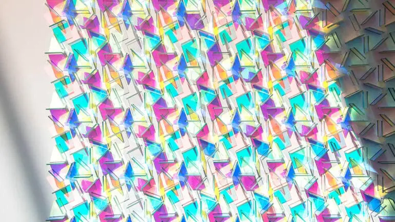Flutter is constructed from a disk of white Corian (a durable material), two metres in diameter. Small panels of glass protrude from each side, harnessing natural light to produce geometric shadows and patterns that change throughout the day. In Flutter, Wood uses dichroic glass—glass covered with a colourless optical coating that reflects particular wavelengths of light. The remaining wavelengths transmit through the glass, producing rainbow-coloured shadows and projections. The material, developed by NASA in the 1960s, has been a staple of Wood’s practice since she was a student at the Royal College of Art in London.