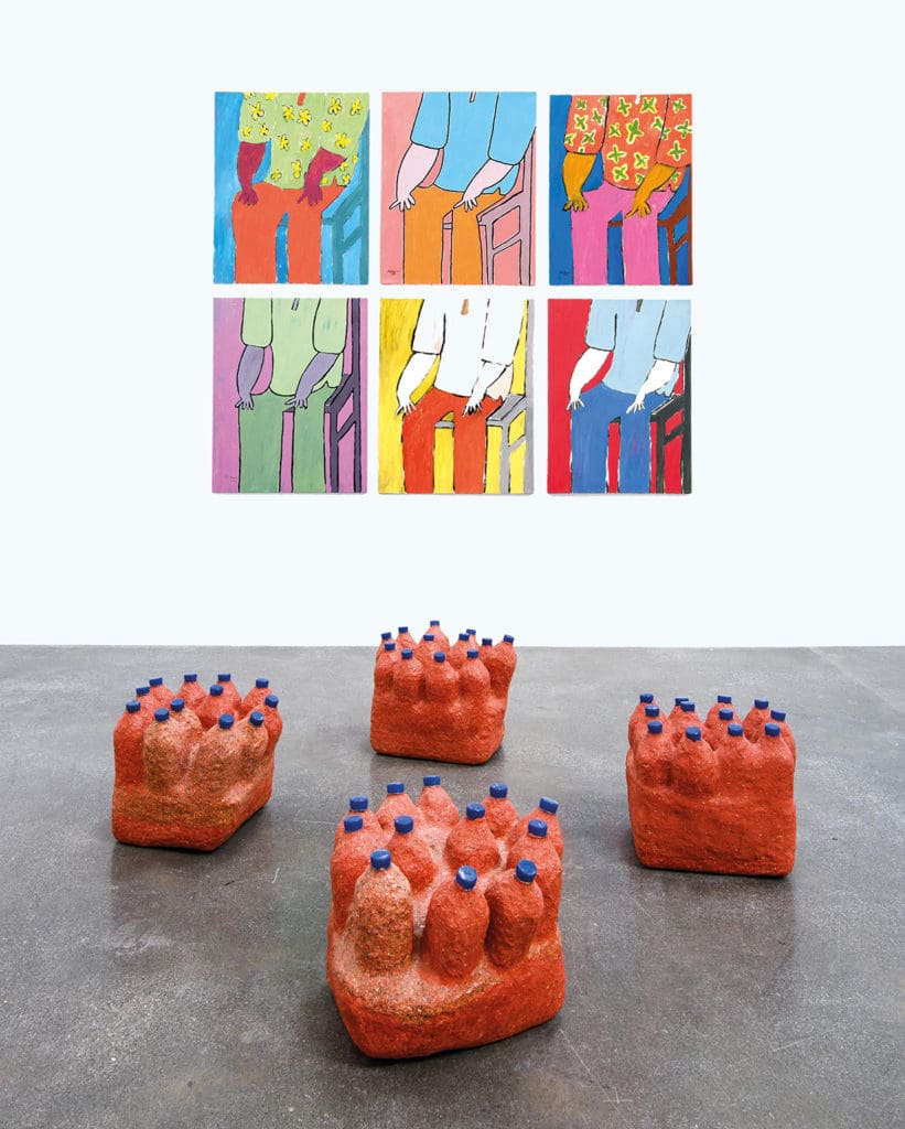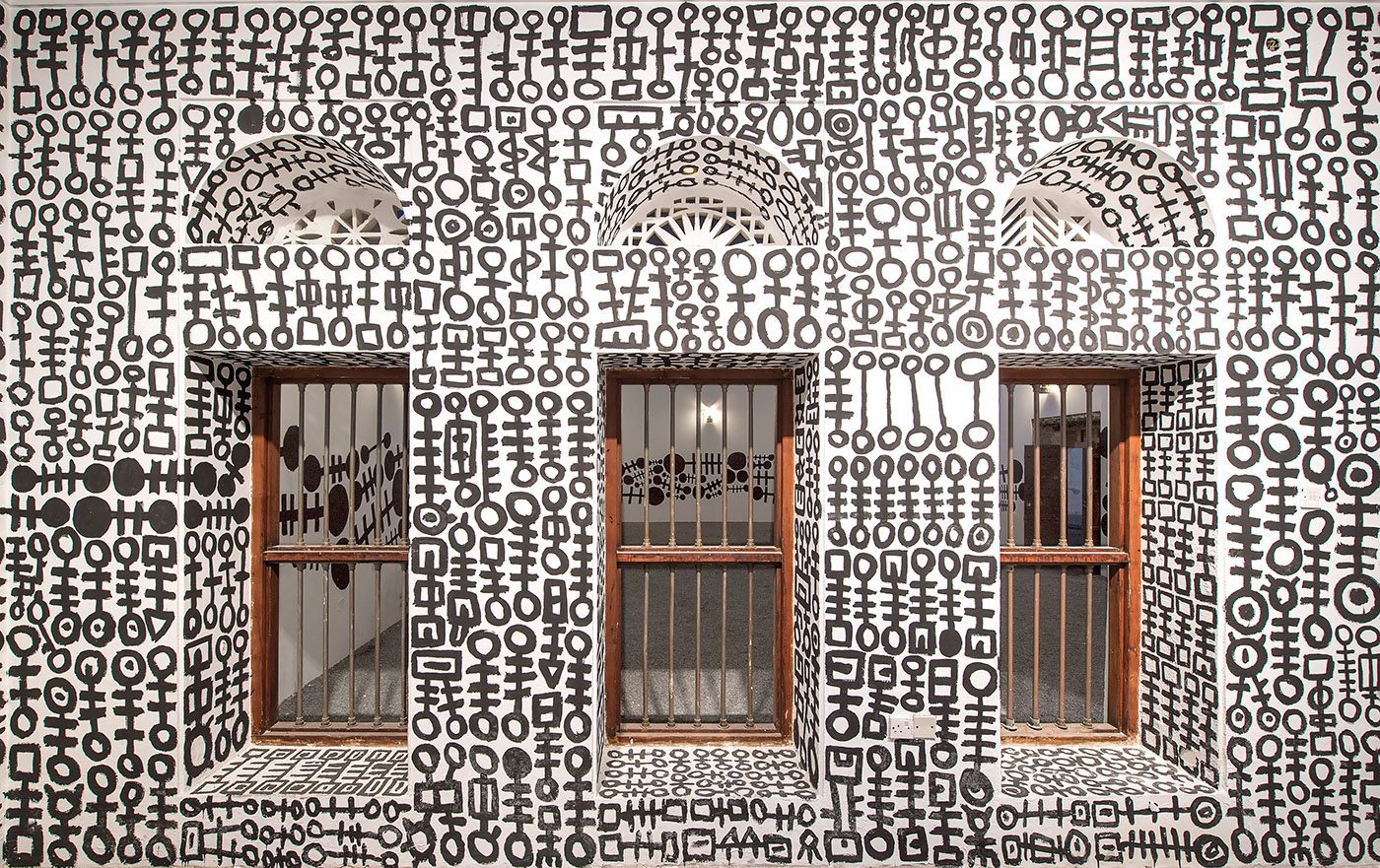 Only on a visit to Mohammed Ahmed Ibrahim’s studio in Khorfakkan truly puts his prolific practice into perspective. Although he carries the label of the UAE’s foremost land artist, the term, which connotes an inextricable relationship between the environment and art, might not be immediately obvious when viewing his oddly bulbous and curiously formed sculptures, or indeed his somewhat obsessive series of paintings depicting only the torso and legs of a sitting man. In several other works, Ibrahim creates small, doodle-like characters repeated, often over large surfaces. Continually, his draughtsmanship returns to the simplest form of mark-making: the humble line.
