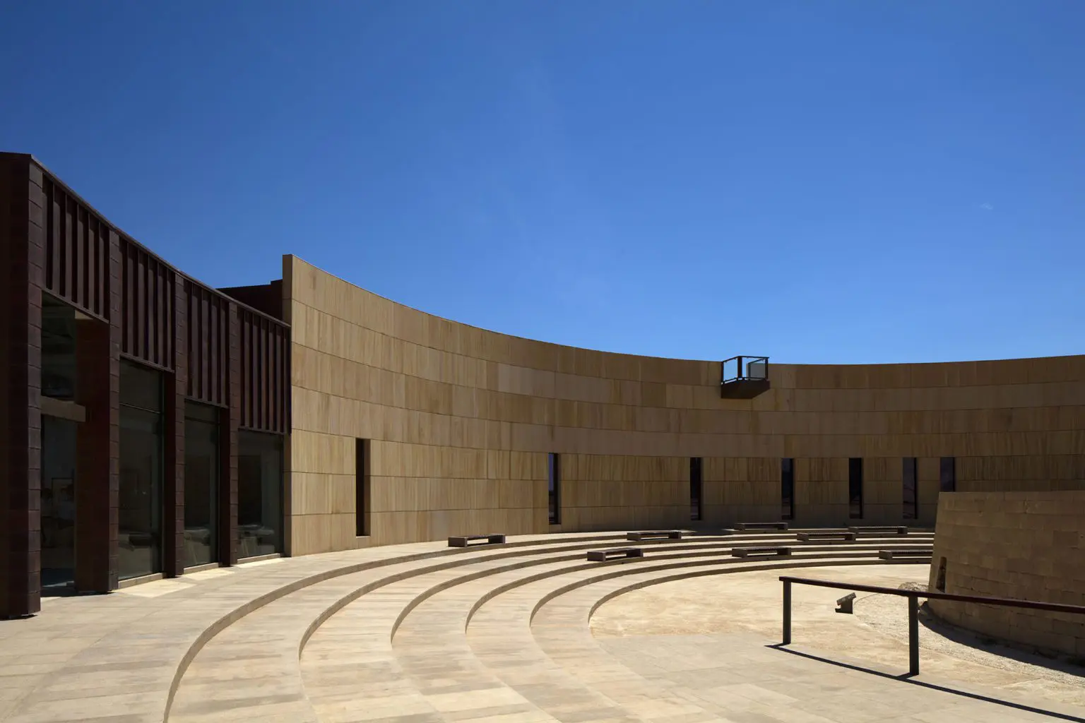 A curved sandstone structure rises gently from the ochre desert floor outside Mleiha, a small town 67 kilometres southeast of Sharjah City and a UNESCO World Heritage Site. Rather than assert itself loudly in the landscape, the understated building is hardly visible against its Fossil Rock backdrop except when approached at close range. The sandstone takes on silver qualities in the light, while its jagged copper roof references both the area’s ancient copper deposits and the mountain outcrop. The humble primacy of the the Mleiha Archaeological Centre’s materiality directs attention towards the Centre’s focal point: the Umm an-Nar Tomb. Constructed around 2300 BCE, it is the most important of the area’s numerous funeral sites.