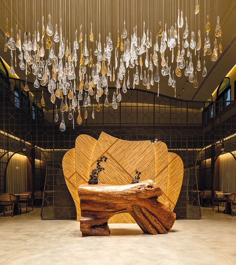A standout piece is Emirati designer Wafa Al Falahi’s sculptural chandelier Roots, made from steel and biodegradable henna-infused bioplastic, inspired by memories of her grandmother. Developed as part of the 2023 Tanween programme, the piece casts a warm glow over diners seated beneath.