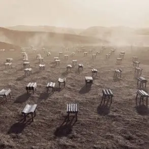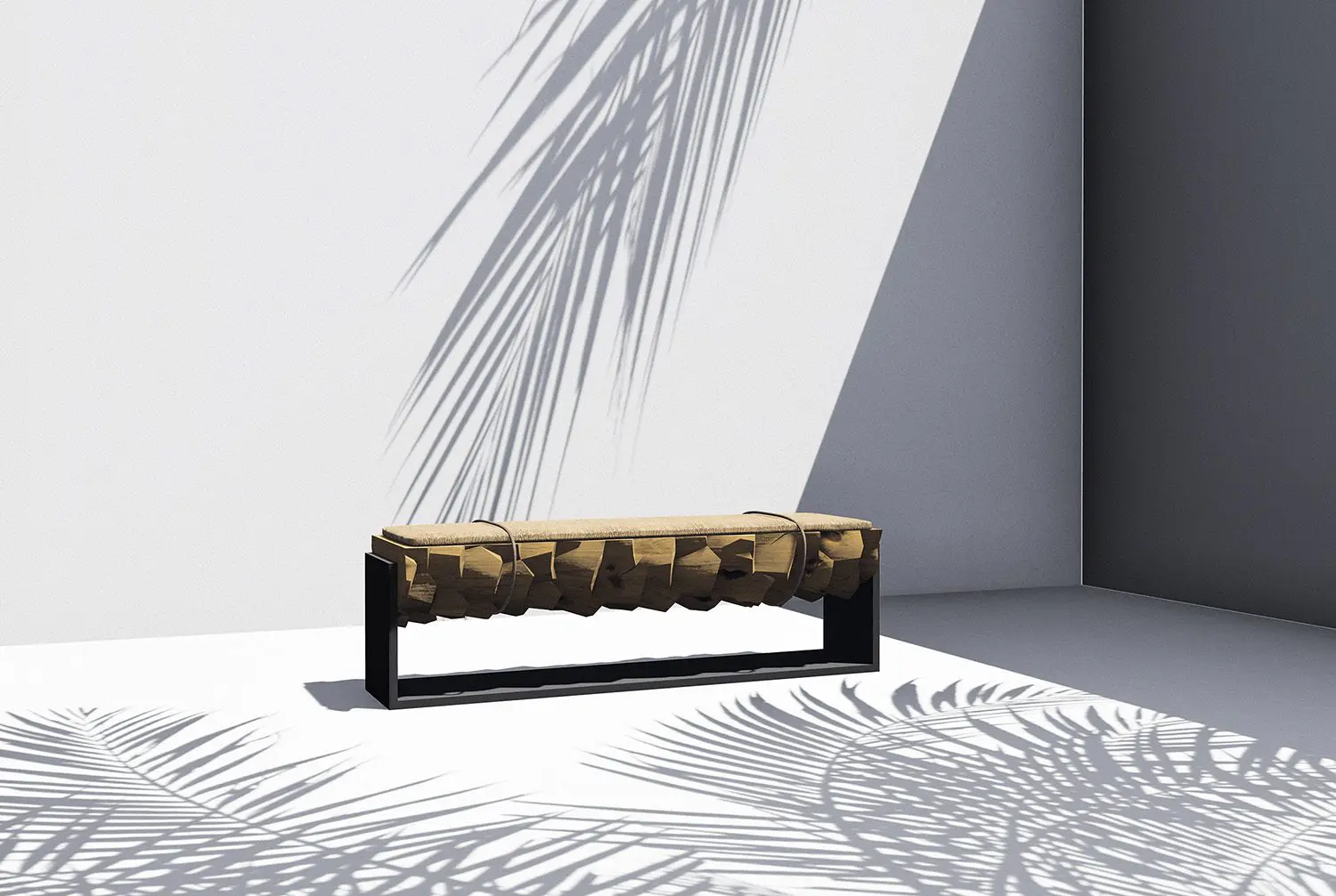 The bench is a palm trunk—locally sourced, reflecting the responsible design ethos—split in half lengthwise. Al Bastaki had observed farmers resting against the trunks of fallen palm trees. “But they’re spiky,” he says. By contrast, the bench gains comfort from a beige linen cushion, held in place by a rope of palm fibre. The bench sits on black metal legs that are deceptively slender—they must support the 70-80 kilogrammes that the half-trunk weighs. “I used my background in architectural engineering to find how to keep the trunk size while keeping the legs small and thin, so the trunk looks as if it’s floating,” he says.