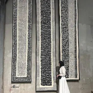 He chose the theme of his first design because “as locals, we love the palm tree.” The dates provide food, the fronds are woven into daan panels for ceilings or room dividers or safeefah baskets or mats. But the trunks themselves aren’t used. Palm Repose fills that gap. —Catherine Mazy