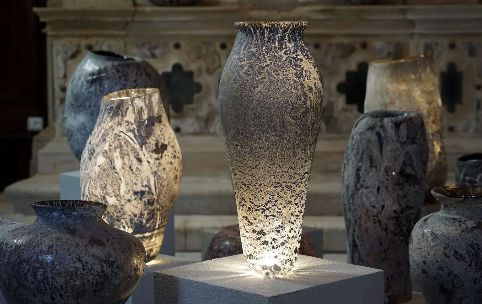 The results play with our expectations of glass. The sculptural objects appear simultaneously contemporary and as if they were excavated from Roman tombs, or from within a volcano. Our understanding of time is confused as they meld the modern and the ancient, and connect the history of early Phoenician glassmaking to its evolution in Venice. They evoke death, in their nod to cinerary urns, and rebirth, through the sisters’ innovation of this traditional craft and in their refusal to treat these metal pieces as waste. The impulse to reappropriate what others see as scraps is equal parts aesthetic curiosity and sustainability focused. Their coffee-table collection, Reconciled Fragments, features resin-encased marble pieces that had been discarded at Lebanese factories.