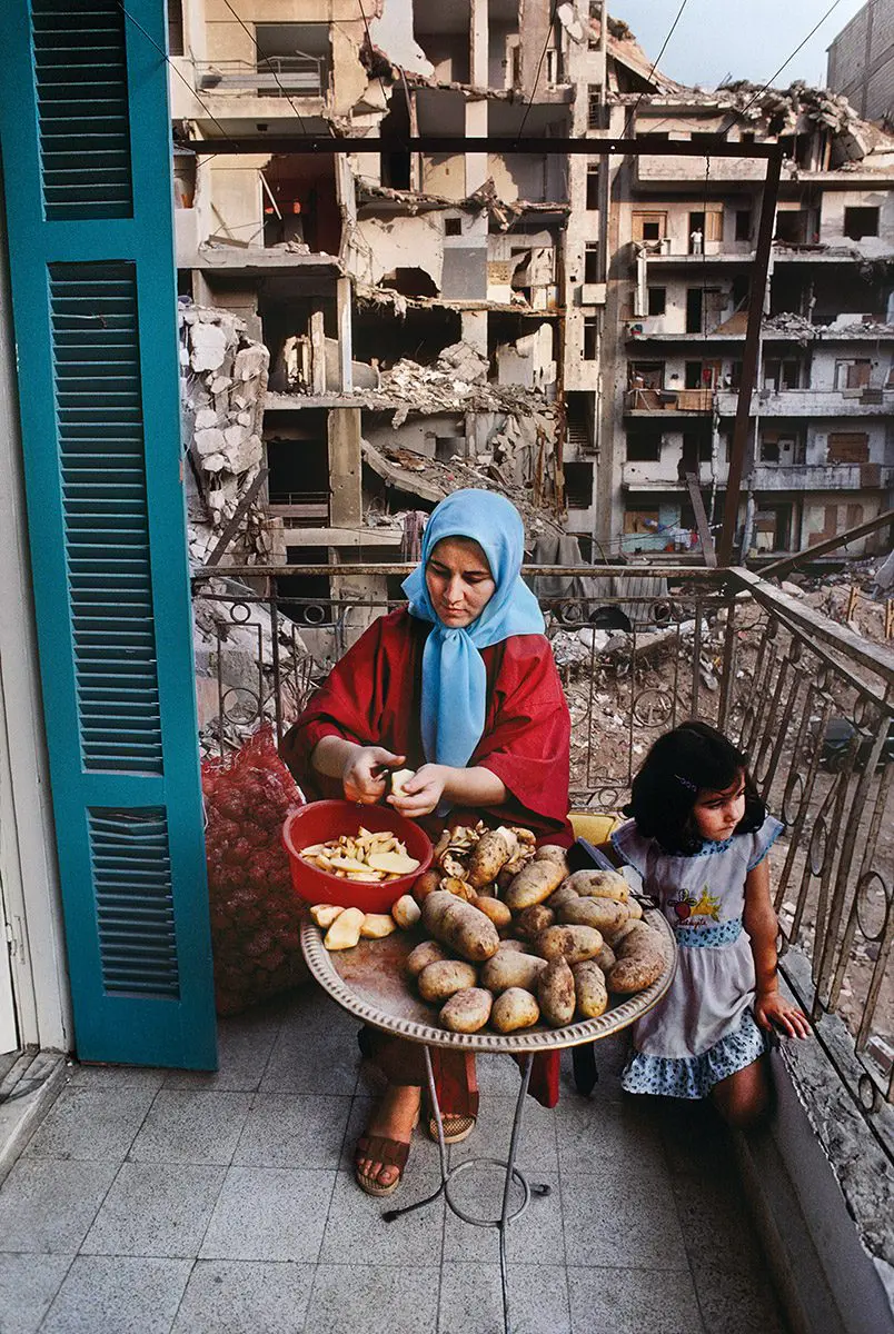 Often, too, the humans provide a contrasting pop of colour. The red dress and sky-blue headscarf of a woman peeling potatoes on her balcony with the bombed-out devastation of 1982 Beirut behind her. The crimson turban of a man on a steam train, the Taj Mahal glowing as white behind him as the clouds of steam rising from below him. A woman in a scarlet sari, alone against the repeating geometric brown steps of Abhaneri, India.