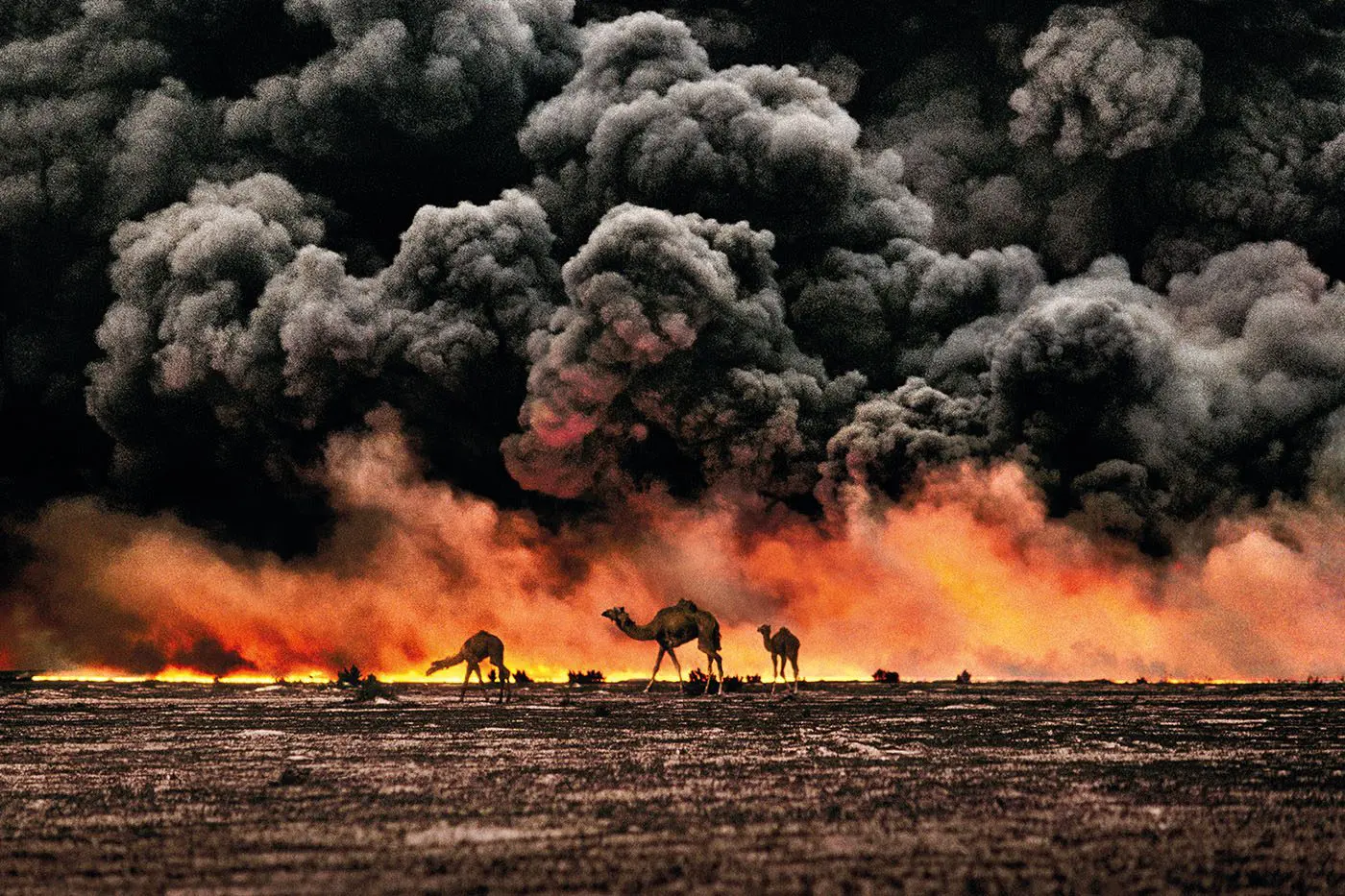 Al Ahmadi, Kuwait (1991). Between blackened sand and sky, camels search for shrubs and water in the burning oil fields of southern Kuwait.