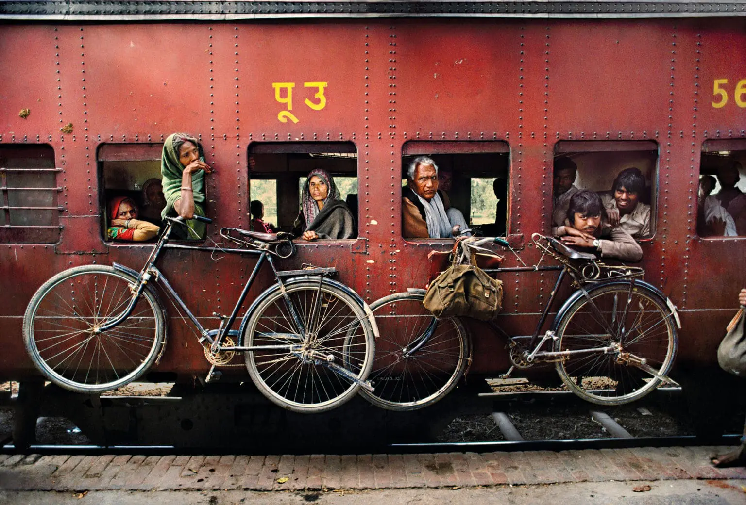 Often, too, the humans provide a contrasting pop of colour. The red dress and sky-blue headscarf of a woman peeling potatoes on her balcony with the bombed-out devastation of 1982 Beirut behind her. The crimson turban of a man on a steam train, the Taj Mahal glowing as white behind him as the clouds of steam rising from below him. A woman in a scarlet sari, alone against the repeating geometric brown steps of Abhaneri, India.