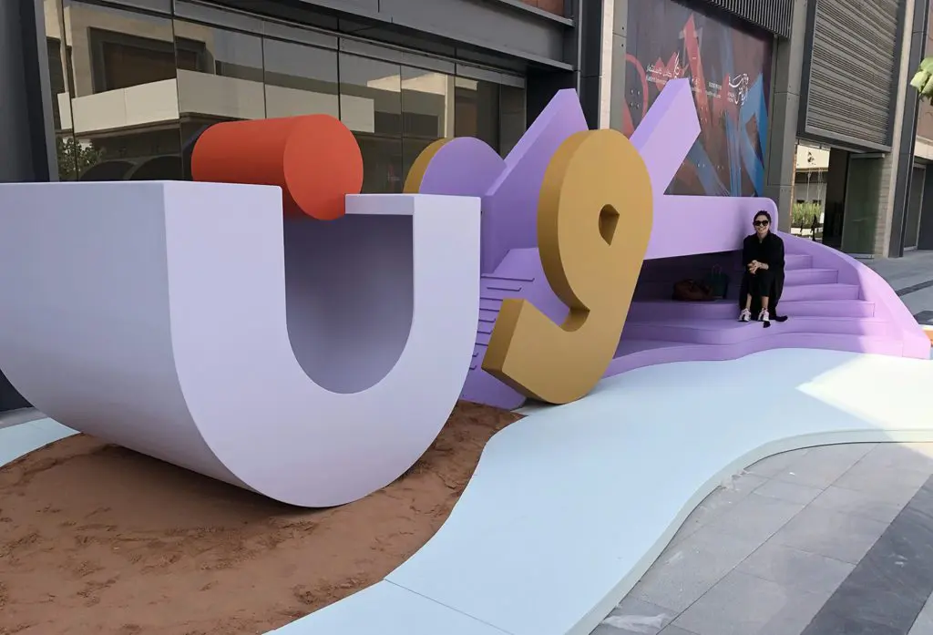 Another of Abulfaraj’s designs, the Malaab series, created colourful playgrounds crafted from letters of the Arabic alphabet. Here the letter Kaff in Riyadh, for Saudi Design Week, 2019. Photo: Lujain Abdulfaraj