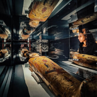 We step inside the Bayt Alsharaf Museum, opened in 2022 by Youssef Al Ameri, who was born and raised in Al Aqr. Like many of his neighbours, he left in the 1990s but has returned to renovate and reopen his house as a showcase of what life was like. Thick stone walls regulate temperatures within, and I bend low to squeeze into the windowless Winter Room, a tiny space designed for cosiness in cold weather, and into the Room of the Sheep, where animals were kept overnight before being released to graze in the morning. Other rooms contain an old radio, cooking utensils, and water containers made from animal skins.