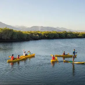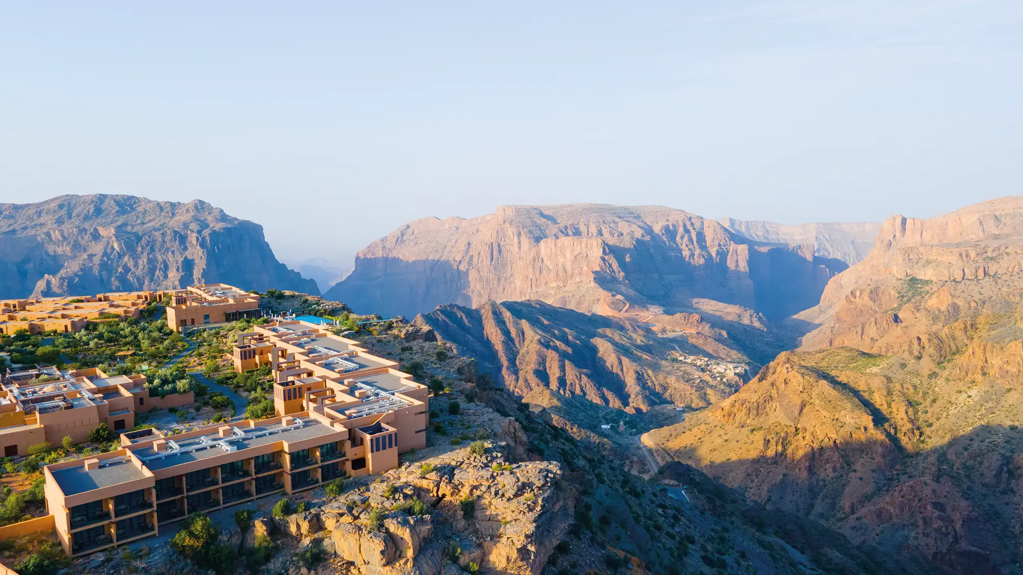 My base for the next few days is the Anantara Al Jabal Al Akhdar, a resort perched 2,000 metres up on a cliff edge where endangered Egyptian vultures ride thermals that rise from the valley below. The property sits above a deep gorge, lined with terraced farms carved out of the vertiginous slopes by farmers over centuries. The three villages we’re walking to—Al Aqr, Al Ayn, and Ash Shirayjah—have also been here for centuries, built in this unlikely place because of its proximity to the water sources that fed, and still feed, the farms. Most villagers left when new houses with modern conveniences arrived at the top of the plateau, freeing them of the need to trek along rocky trails to get home.
