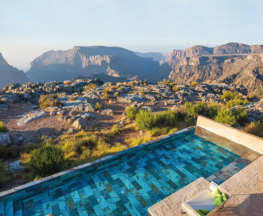 Top, two hours’ drive inland from Muscat, Jabal Akhdar offers cooler mountain air, dramatic canyon views, and stargazing from the platform where Princess Diana once stood. Above, the swimming pool at the Anantara Al Jabal Al Akhdar Resort offers expansive views, and relaxation after a day spent hiking. Top image by Paul Thuysbaert, both courtesy of the Anantara Al Jabal Al Akhdar Resort.
