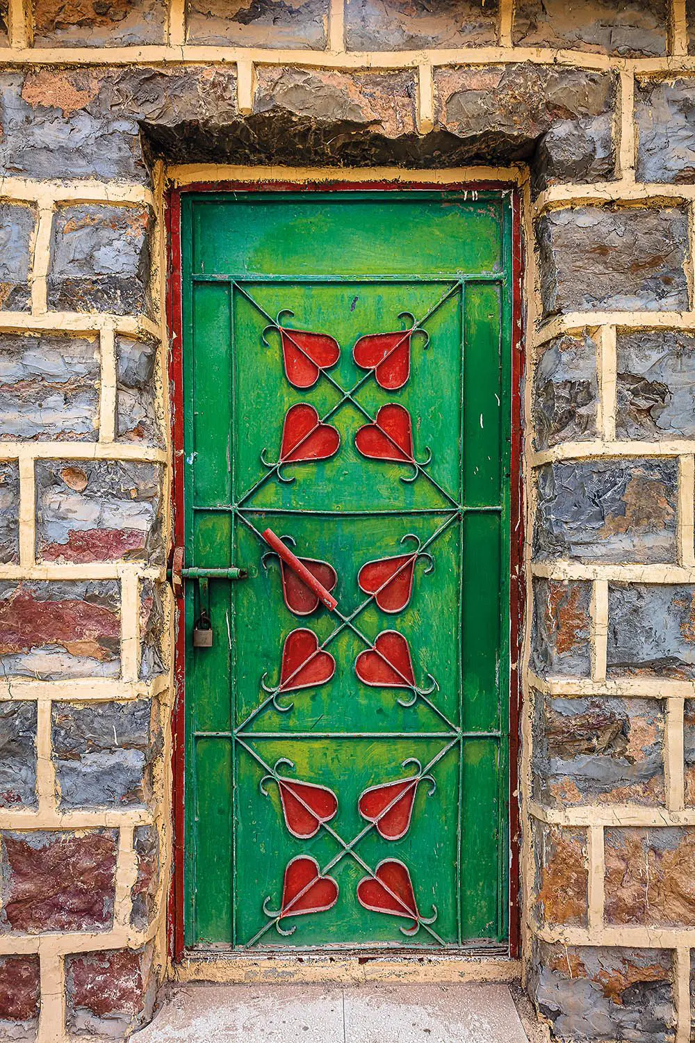 The sun is high by the time we reach Sheri. In the intense dry heat, we make our way between the small dwellings. Padlocks are on most of the doors. Pens that once housed goats are empty, the gates swung open. We step across a falaj, a channel built to guide rainwater between the terraces. A lizard appears, tilting his head.