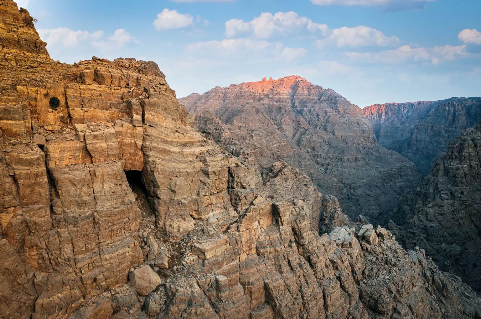 Wadi Naqab holds numerous hiking trails, for all ambitions and abilities. Along with the terraces, there are donkey trails that meander between the lower slopes, past small farmhouses with stone walls and colourfully painted metal doors. In the upper mountains, more remote trails explore long-abandoned settlements. Tribes in the Ru’us Al Jibal once cultivated seasonal crops, such as wheat, dates and watermelon. They collected wood and wild honey from mountain hives, and traded bread, goat’s milk and cheese with fishermen along the coast.