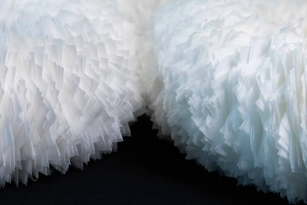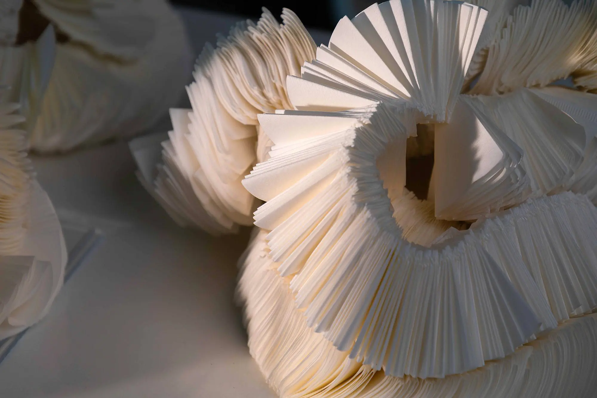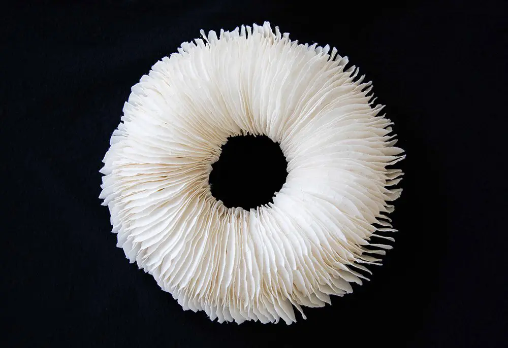 Millns has dedicated her life’s work to elevating society’s quotidian items into artforms. Through delicate and labour-intensive processes, Millns uses a needle and thread to tie hundreds of coffee filters together to form large, round, collar-like objects that resemble Elizabethan-era ruffs. In other works, she hand-cuts unused tea bags, empties out the powder (saving it, of course), and uses the fragile paper in circular arrangements that are striking and surprising in their beauty. Almost always, paper is her medium of choice and her works are made in units or series. She never produces only one object. “I’ve always done multiples because it is the spaces in between the objects that allow the viewer to participate,” she explains.
