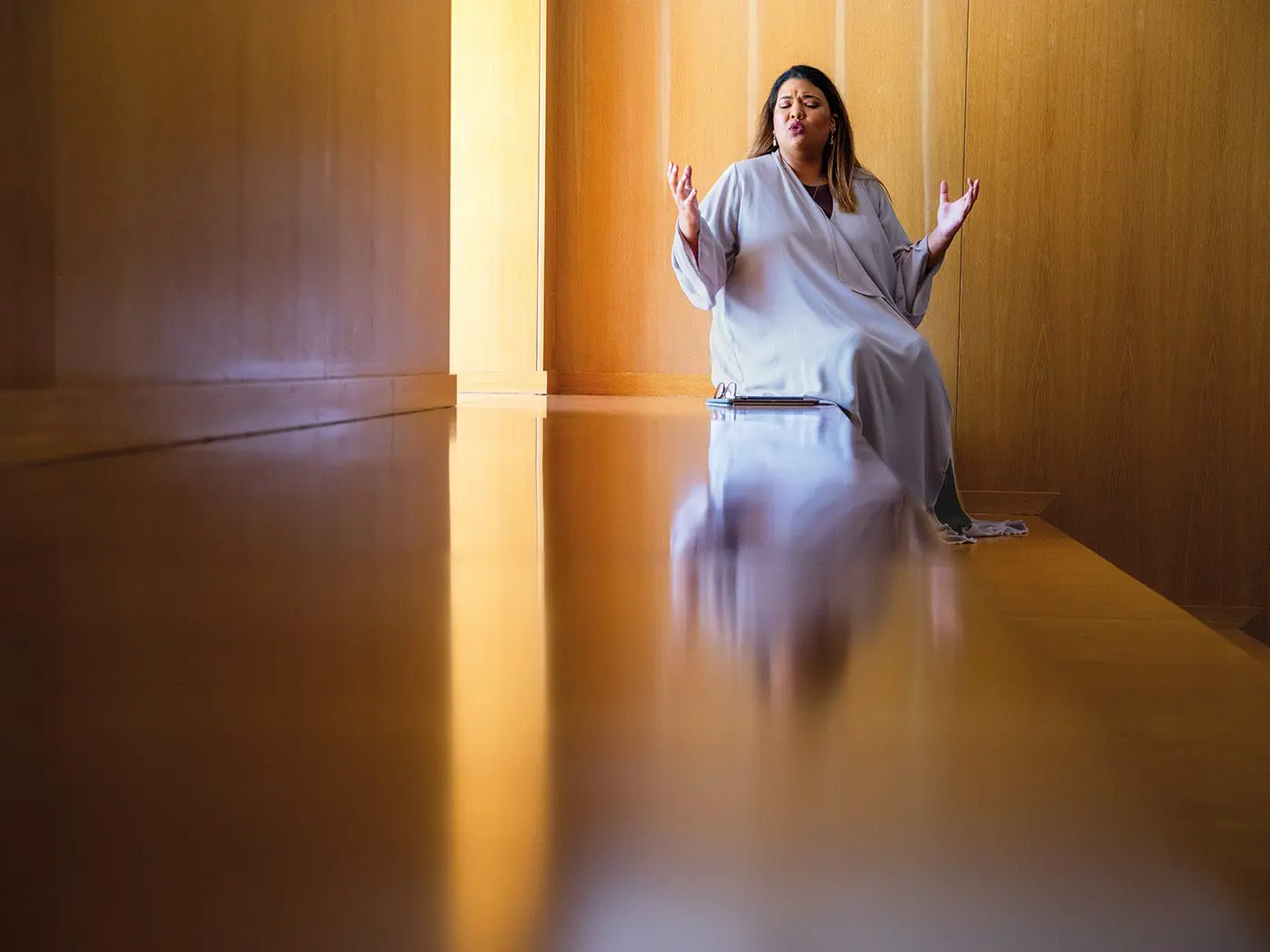 Dr. Afra Atiq performs her own poems, not singing but speaking them. Spoken-word poets borrow elements of rap, jazz, hip hop, and word play. In a video of her performance at Sharjah’s Entrepreneurship Festival in 2017, Dr. Atiq stands in front of a microphone, her strong voice reflecting her passion and her recitation borrowing elements from rap, as when she speeds up certain verses to captivate and uplift the listener.