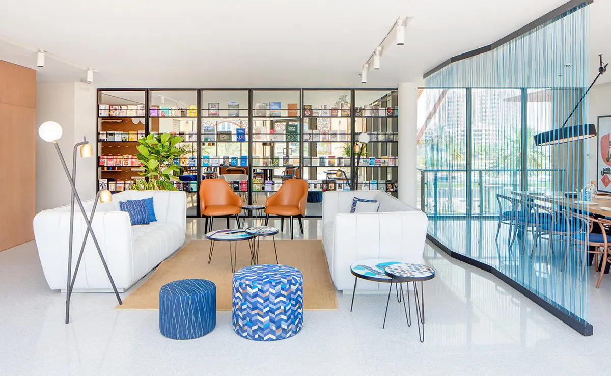 The interior design is the work of Dubai-based studio Roar. Clean lines, open space and a natural palette, punctuated by bold-print tiles, table tops and stools, give it a calm and cool Scandinavian aesthetic. The design was inspired by books and playful literary references are all around. The woven handrails and space dividers recall the stitching in book spines. Open book shelves are in the centre of the floor allowing light and shade to dance around the space. —PD