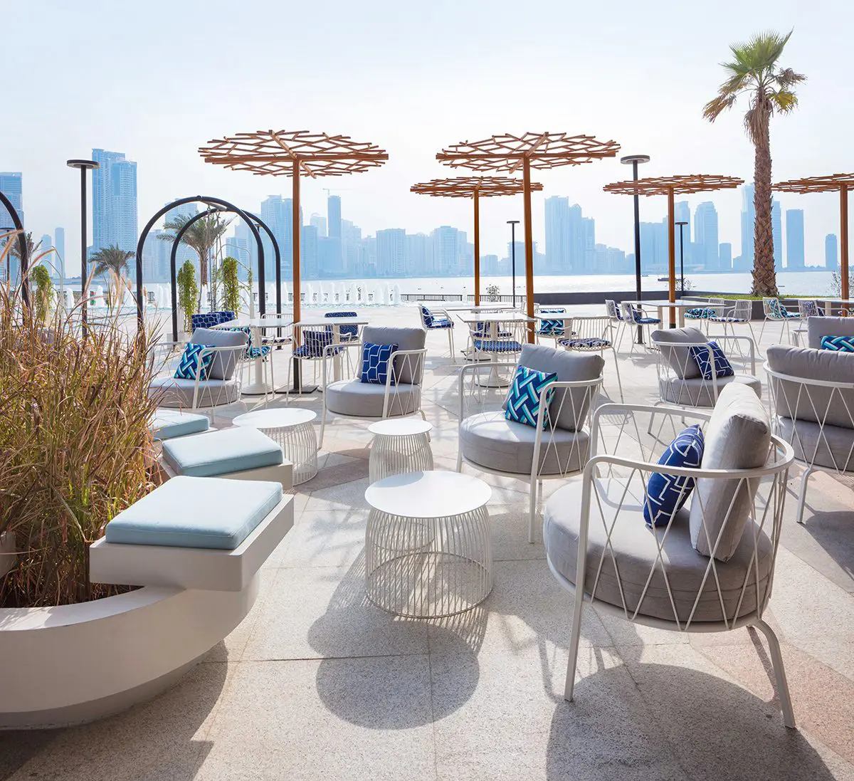 The interior design is the work of Dubai-based studio Roar. Clean lines, open space and a natural palette, punctuated by bold-print tiles, table tops and stools, give it a calm and cool Scandinavian aesthetic. The design was inspired by books and playful literary references are all around. The woven handrails and space dividers recall the stitching in book spines. Open book shelves are in the centre of the floor allowing light and shade to dance around the space. —PD