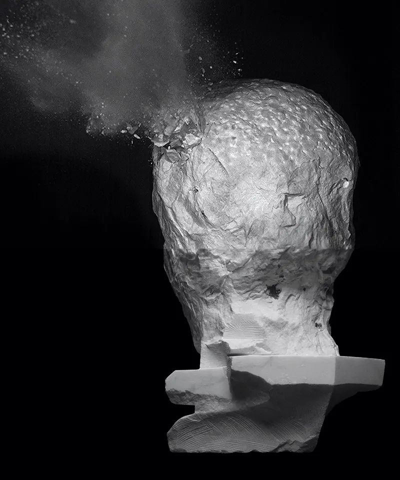 For Shot Head (2015) top, Jaber performed a variation of Michelangelo’s definition of sculpture—that which is done by means of removal—by firing 64 bullets at the marble. It was inspired by the destruction of ancient monuments such as Palmyra in Syria. Above, Jaber depicts body parts in states of unrest, fragmented and unnatural, metaphorically deformed and diseased. He juxtaposes polished features with still-rough stone. The interplay between the beautiful and grotesque has been a constant. Video still and above photo courtesy of the artist.