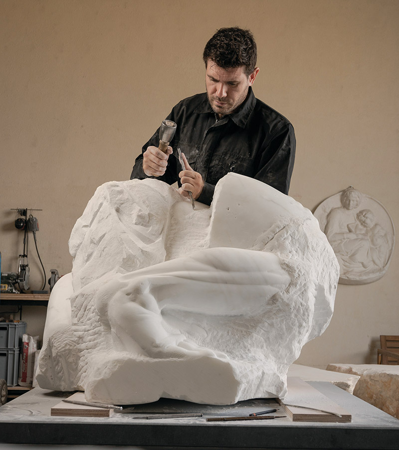 An obsession with Florence’s sculptural bounty spurred Jaber’s total immersion in stone. As a student at Antwerp’s Royal Academy of Fine Arts, he committed himself to the medium despite a curriculum that de-emphasised it in favour of figure modelling with clay and conceptual work. About four hours a week were allotted to stone sculpting, but he needed more time. “I spent days and nights in that studio,” he recalls. “I had to be there every day to absorb as much as possible.” No one else was as devoted, which he considers unsurprising. “It’s slow, heavy, dirty, messy, and not something that fits today’s time, when people want everything to be fast,” he says. When his professor retired, he offered Jaber the position immediately upon his graduation. Jaber stayed for 15 years.